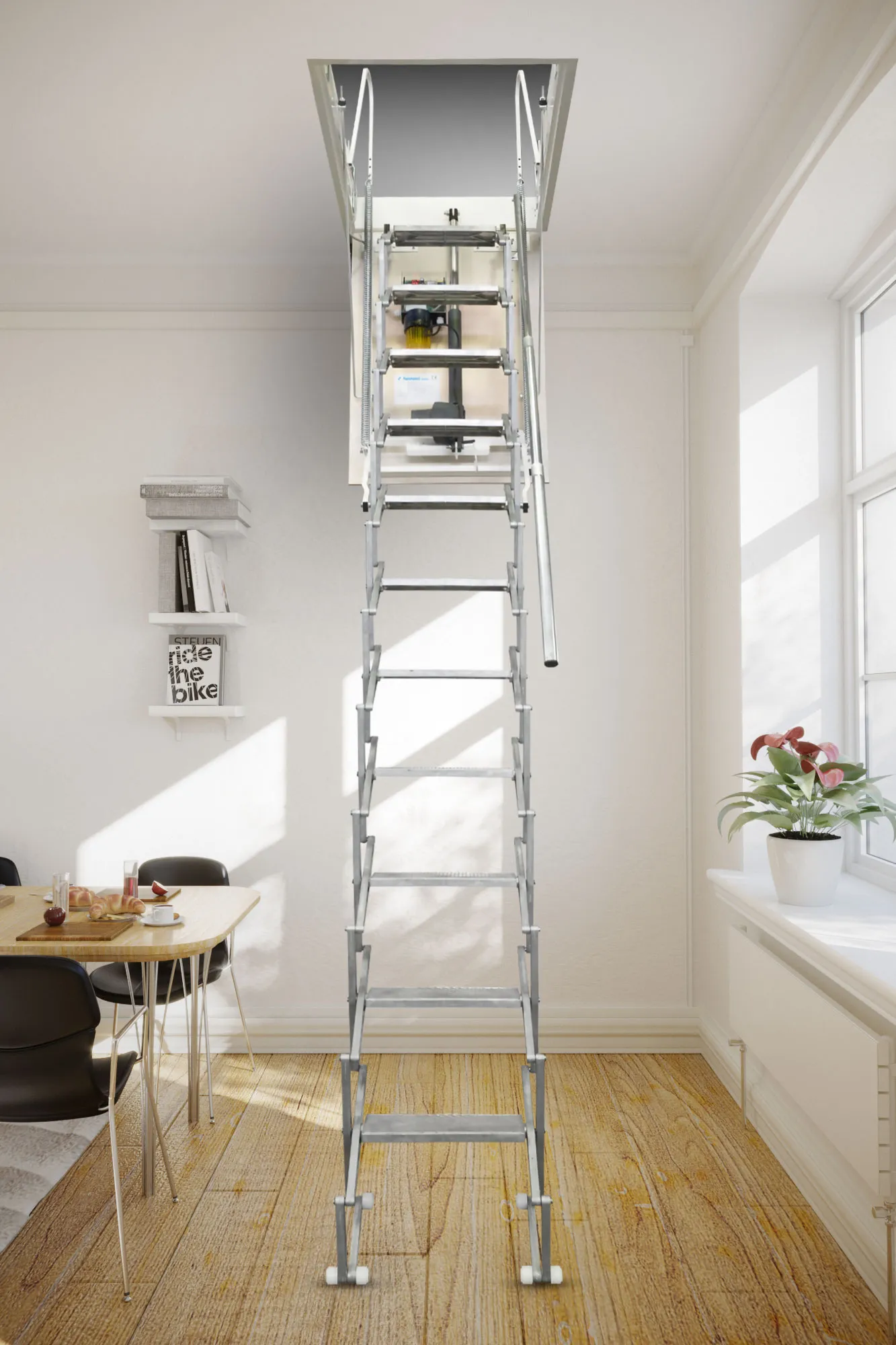 Складная 4-х секционная чердачная лестница. Ступени выполнены из сосны, имеют противоскользящие насечки, направляющие из металла.