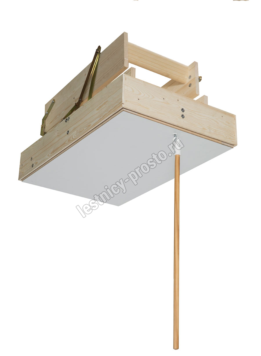 На ступенях лестницы антискользящие насечки. Люк с двух сторон облицован ДСП белого цвета. Размер короба: 900 × 576 мм