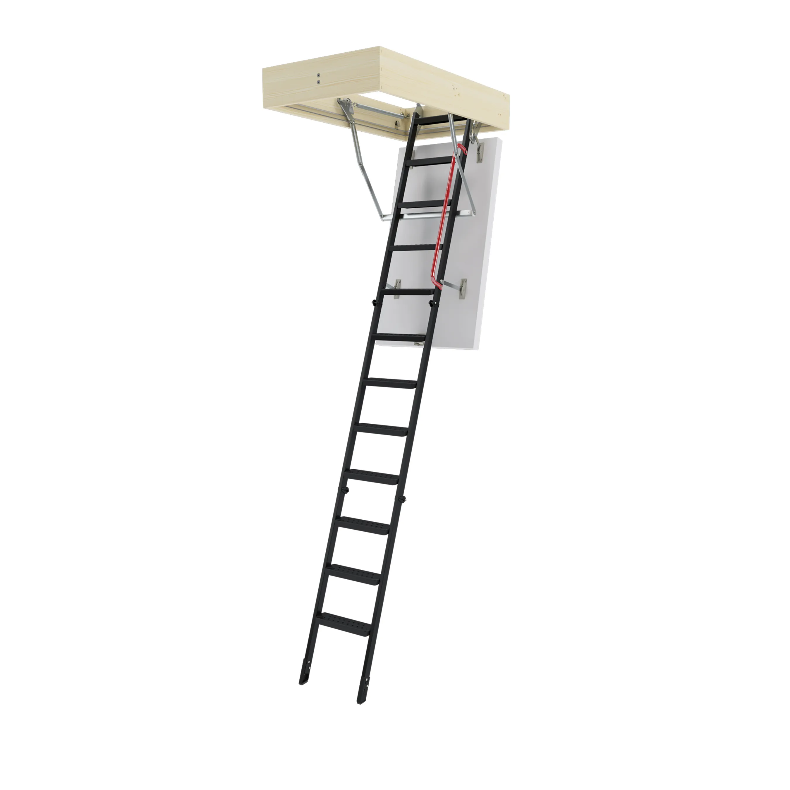 Все элементы лестницы выполнены из экологически чистых материалов и обработаны веществами, не содержащими тяжелых металлов. На ступенях антискользящие насечки. Короб лестницы изготовлен из металла. Термоизоляционная крышка типа "сэндвич" утеплена пенопластом, облицована с двух сторон ДСП белого цвета. Короб люка с уплотнителем. В комплекте деревянный стержень для открывания лестницы.
