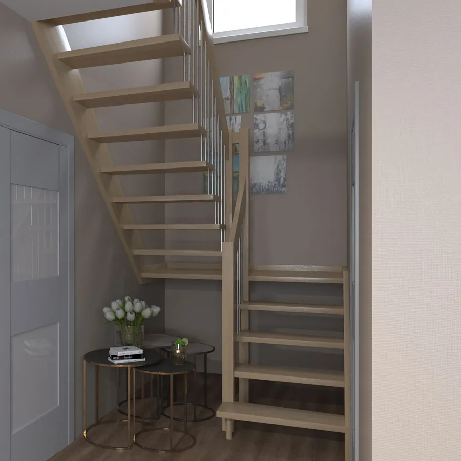 Компактная деревянная лестница с металлическими стойками перил. Легко собирается и занимает небольшое пространство на первом и втором этаже. Фиксированный квадратный короб на верхнем уровне обеспечивает дополнительную прочность конструкции. Монтаж осуществляется силами двух человек на объекте по указаниям, приведенным в паспорте на лестницу.