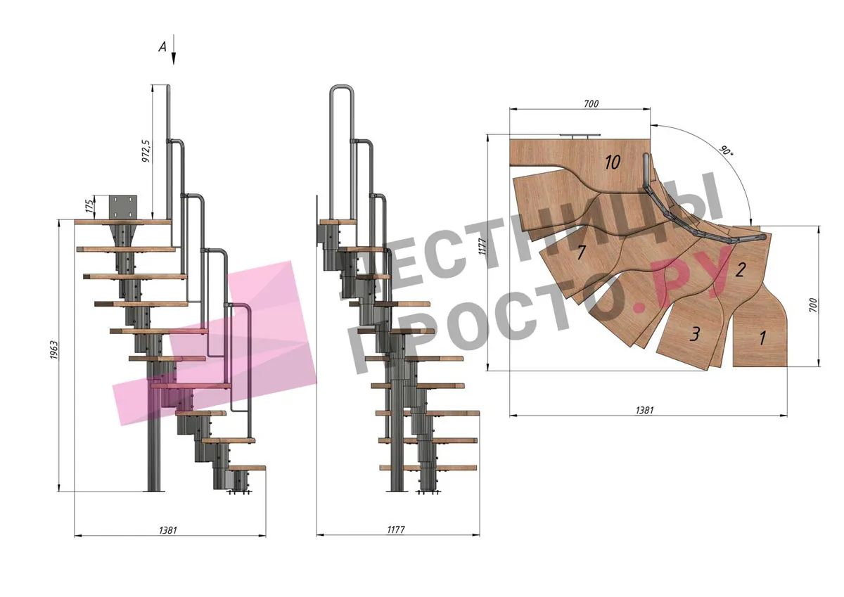 Лестница Prosto Urban Black гусиный шаг 700 мм, h180-264 см (10 ступеней), дуб