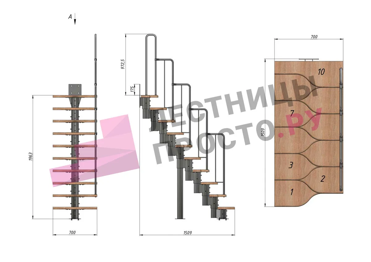 | Лестница Prosto Urban Black гусиный шаг 700 мм, h180-264 см (10 ступеней), бук |