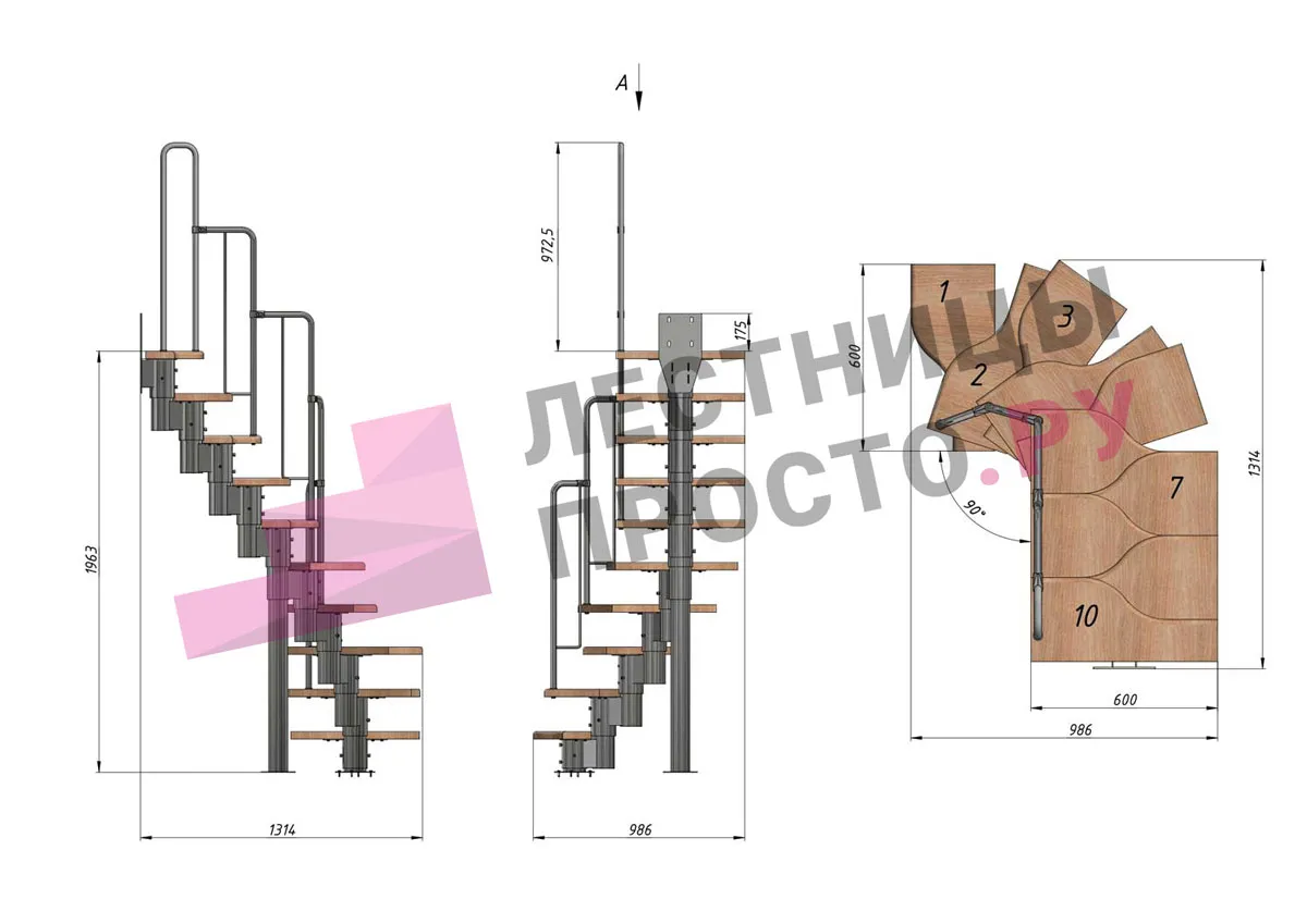 Лестница Prosto Urban Black гусиный шаг 600 мм, h180-264 см (10 ступеней), ясень