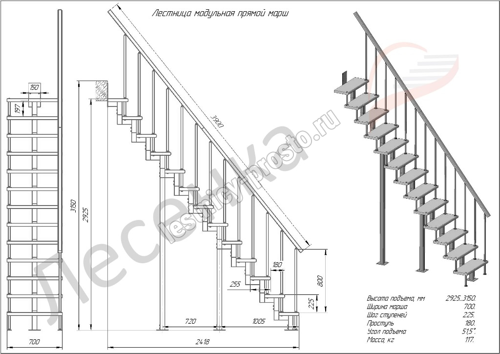 Высота лестницы 2925 - 3150 мм