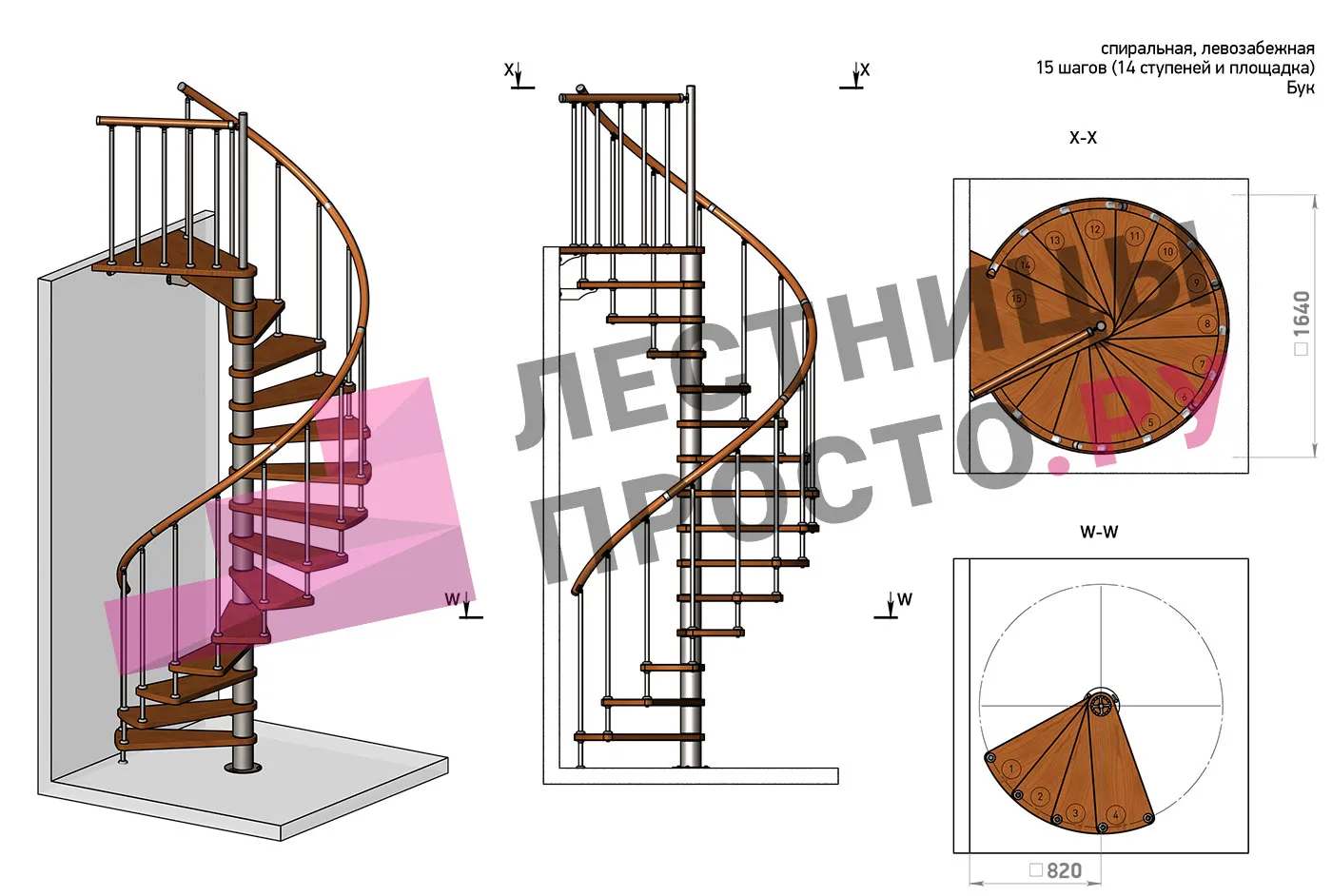Левая, d=120см, 14 ступеней + площадка