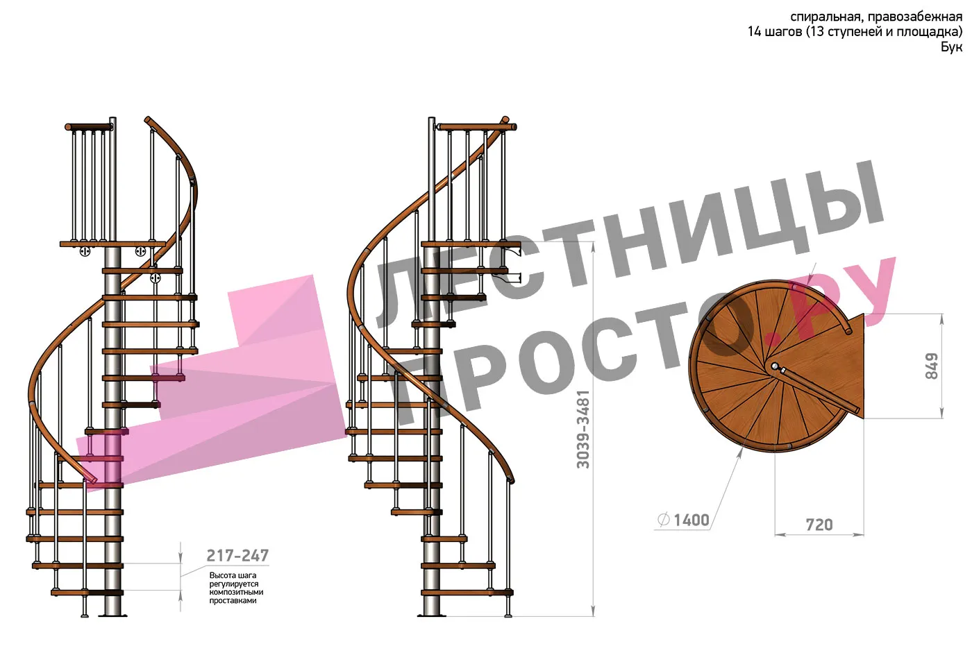 Правая, d=140см, 14 ступеней + площадка