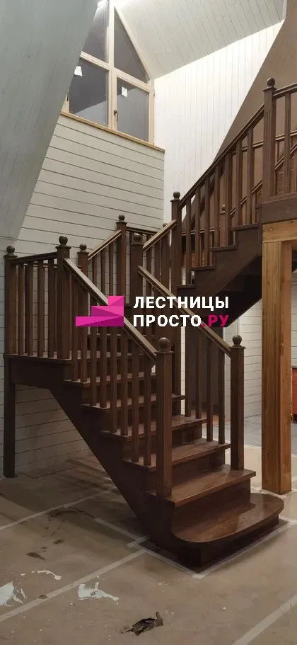 Деревянная лестница с поворотом из сосны для частного дома