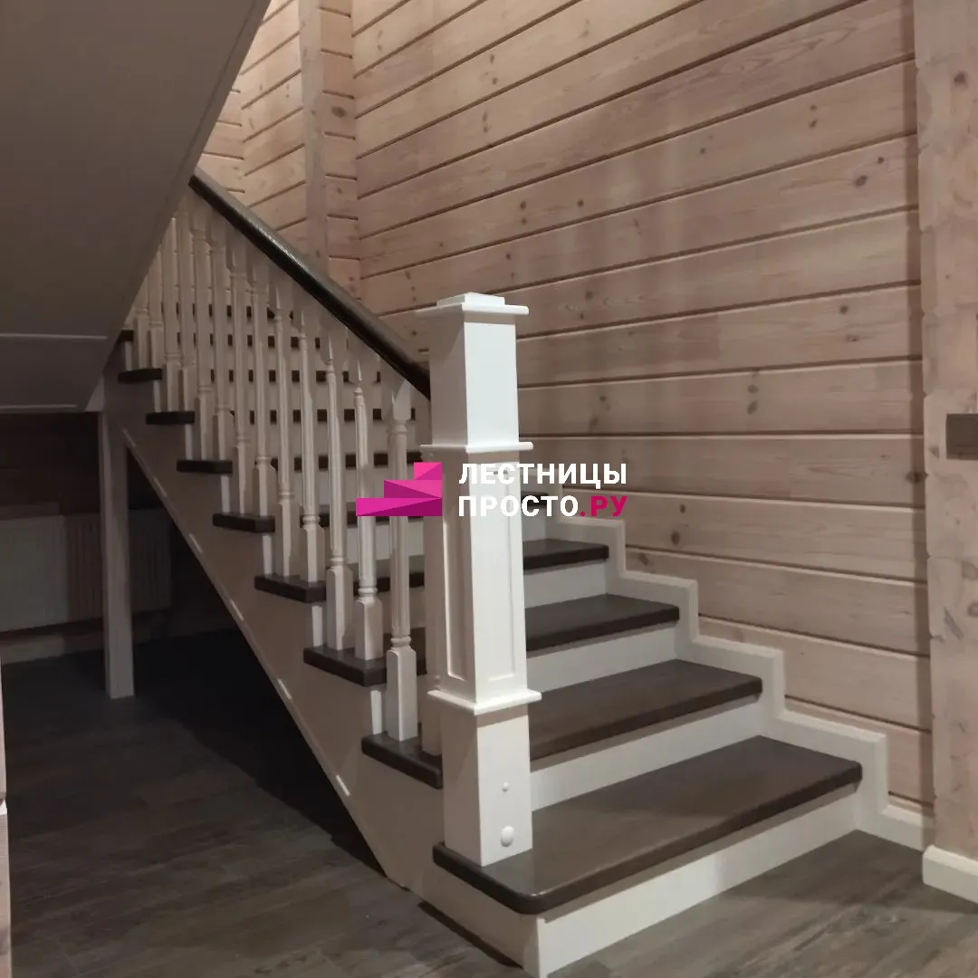 Лестница из сосны с поворотом и подступёнками для частного дома